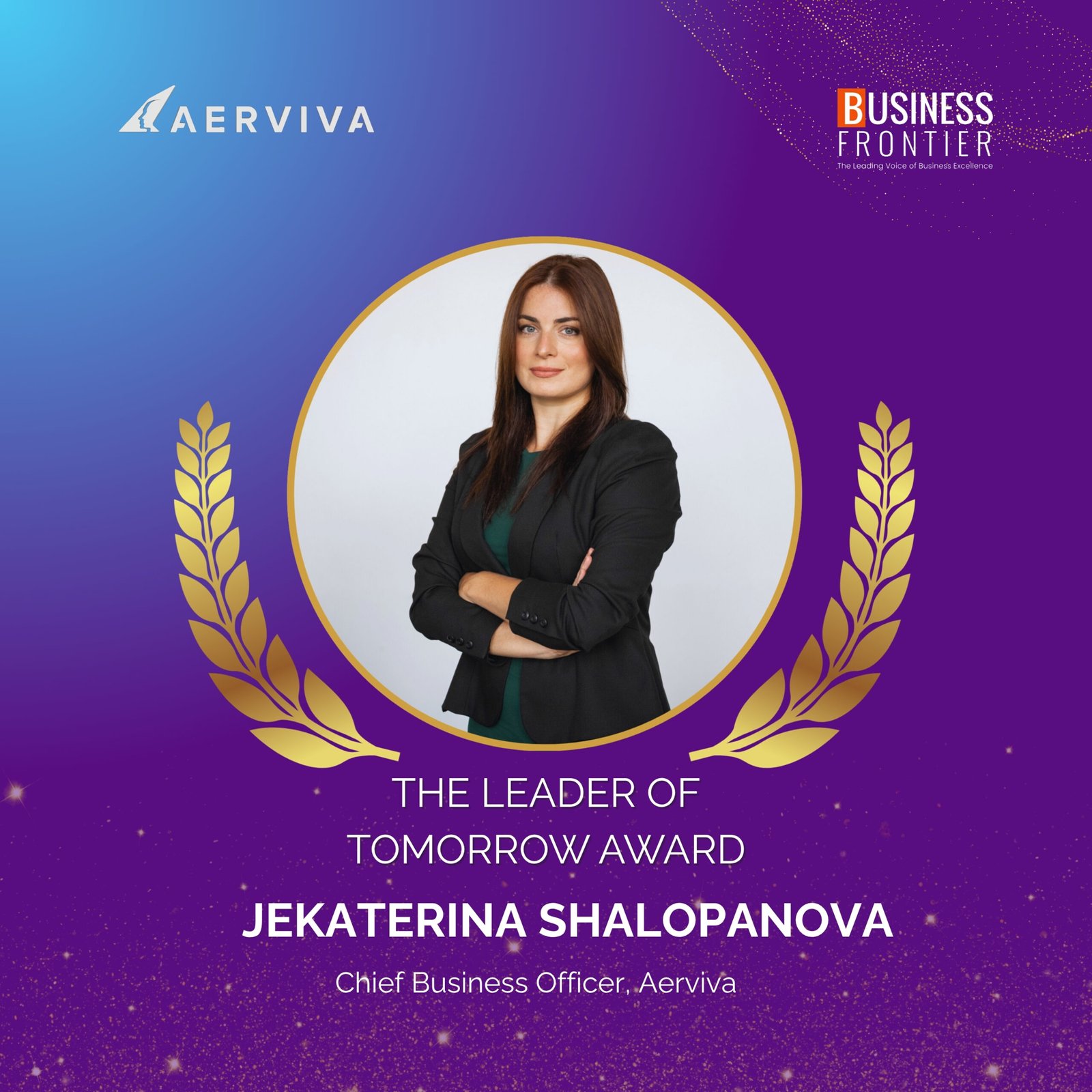 Ms. Jekaterina Shalopanova, AERVIVA’s Chief Business Officer has been honored with the prestigious‘ Leader of Tomorrow Award’ for her visionary leadership and transformative contributions to the industry. This accolade celebrates her innovative approach and commitment to shaping the future of business.
