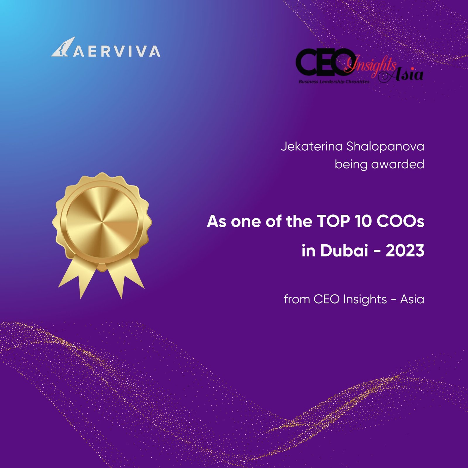 Ms. Jekaterina Shalopanova, Chief Operating Officer of AERVIVA, has been recognized among the Top 10 COOs in Dubai – 2023 by CEO Insights Asia. This global honor highlights her excellence in operational leadership and strategic execution. Her contributions continue to drive innovation and elevate standards within the aviation industry.