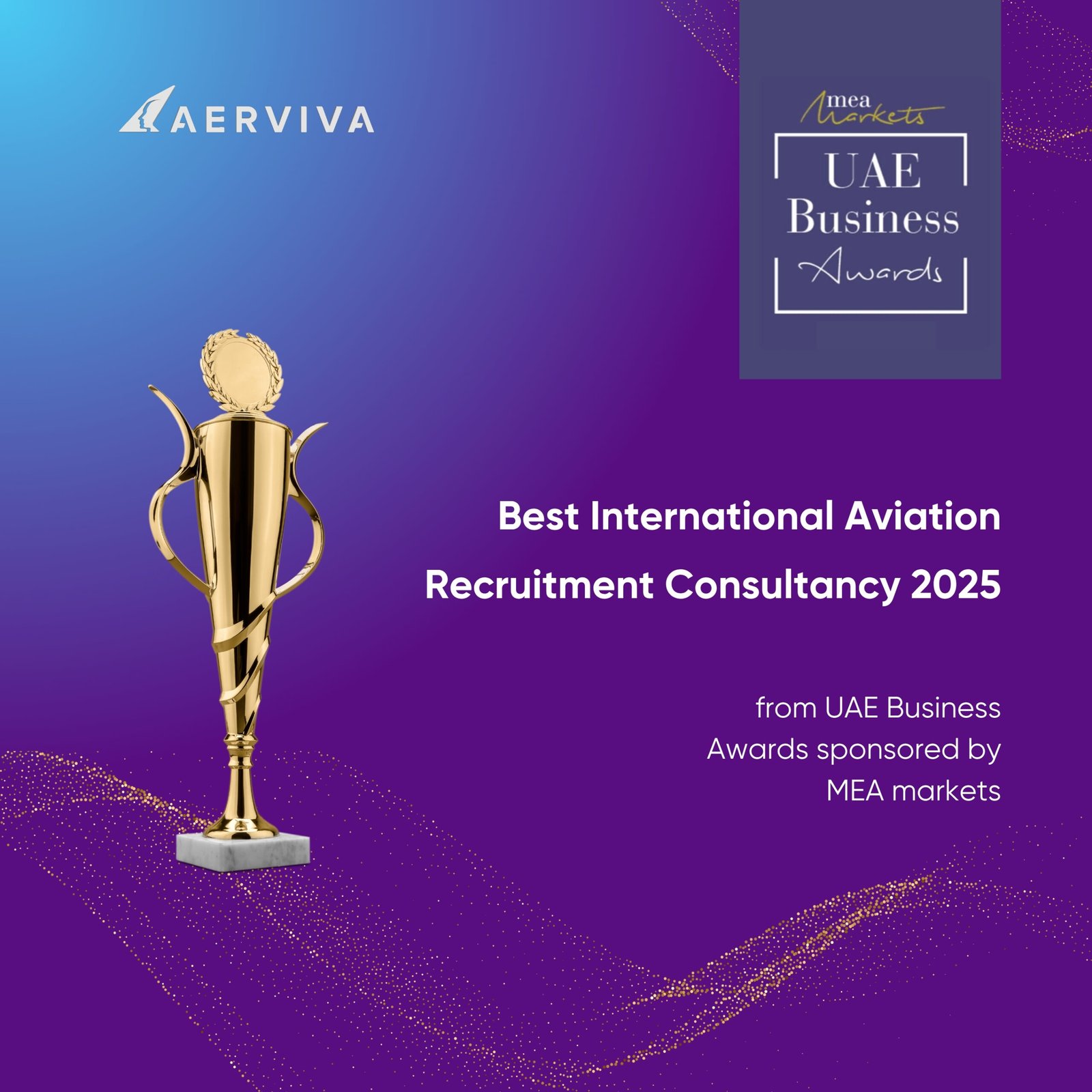 Recognized as the ‘Best International Aviation Recruitment Consultancy 2025’ by UAE Business Awards, AERVIVA stands out for its global expertise, tailored talent solutions, and unwavering commitment to client success in the aviation industry.